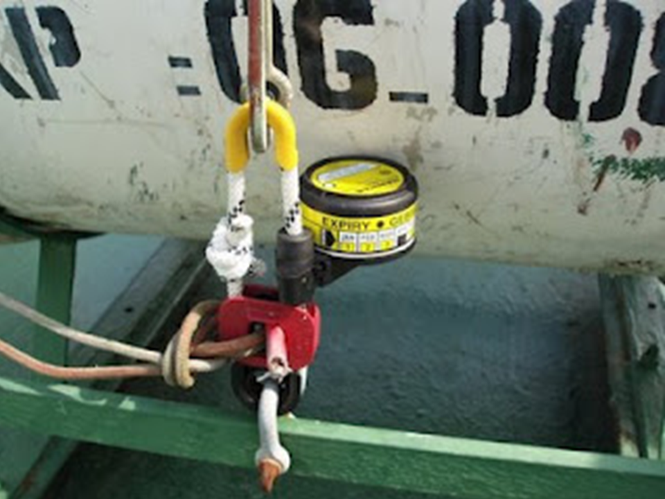 They are composed of a double stranded white cable, a releasing mechanism and a red fusible wire with a breaking voltage of 2,2 ± 0,4 kN. The white cable is fixed to the deck or to the cradle of the raft and secured to the fastening strap with a Davit. When activated, the knife cuts the cable, allowing the free floatation of the raft. While the boat sinks, the floating rope is stretched until the raft inflation.