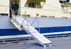 - Based on its mass evacuation system, Brude developed gangway systems for safe access on board, ensuring a versatile access solution. These systems are made by a complete with coaming, mounted doors, telescopic gangway with railings, hydraulic unit and a control panel. When is fully extended, the ladder has a length of 8,70 meters and a maximum height of 5,80 meters.